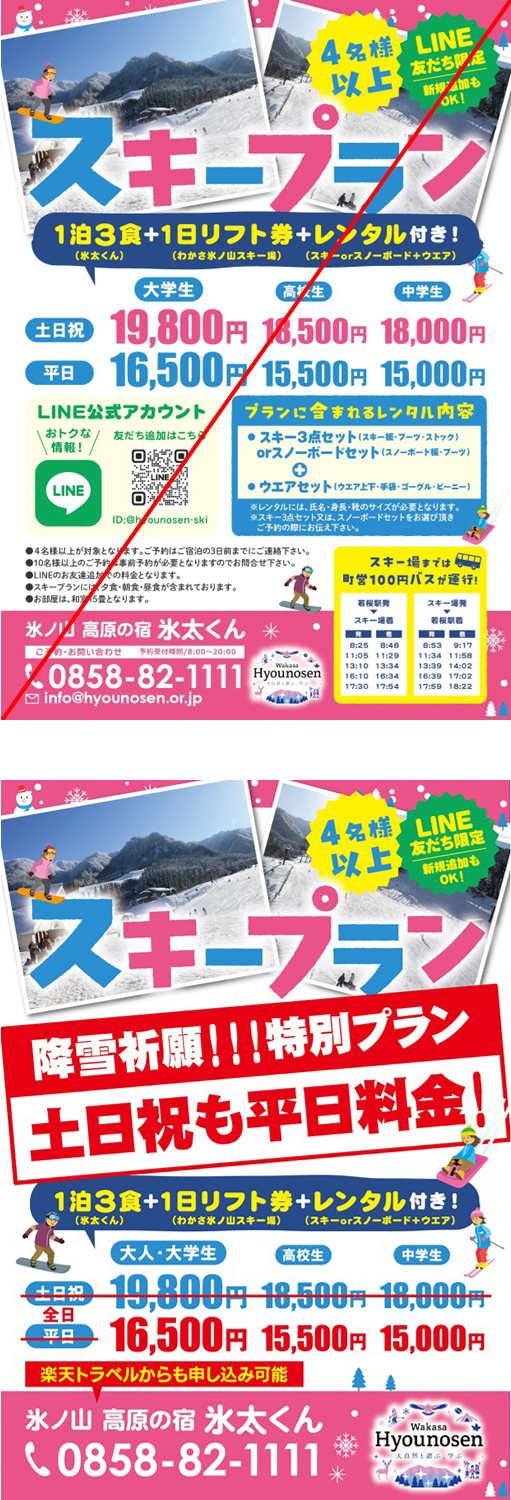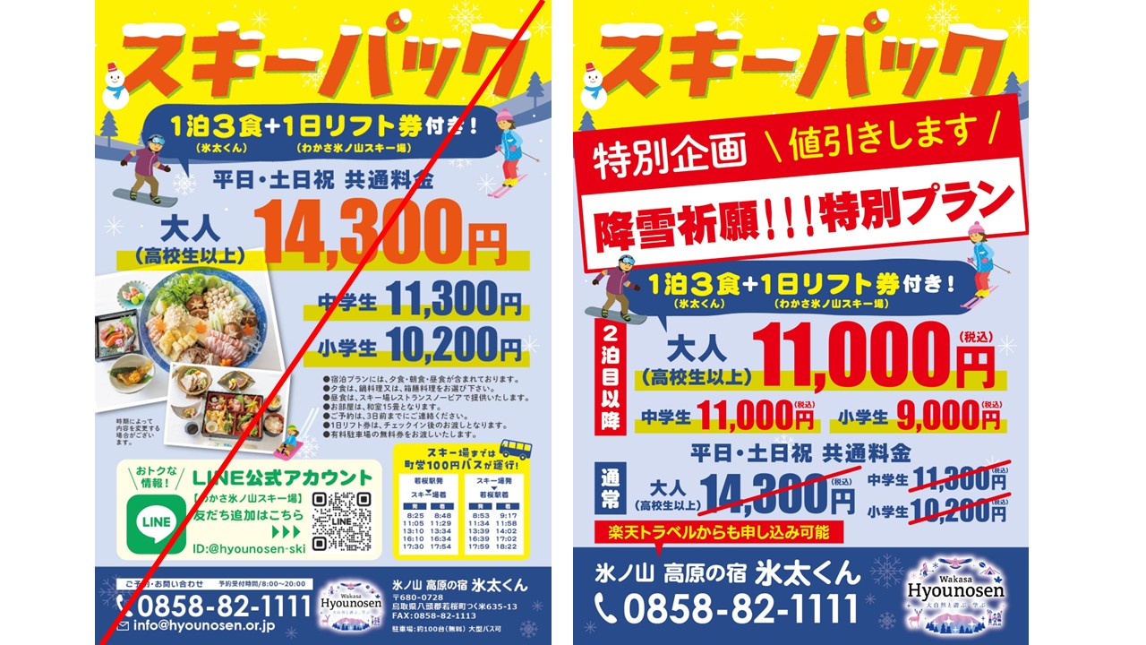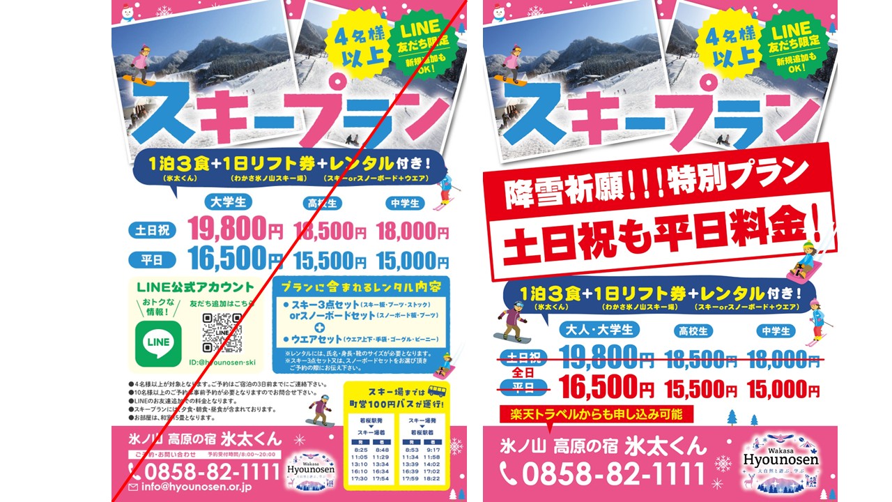 宿泊・お食事とスキーリフト券がセットになった「スキーパック」と、さらにスキー/スノボとウェアレンタルもセットの「スキープラン」が今シーズンも降雪に恵まれることを祈って、おトクな料金に変更されました!